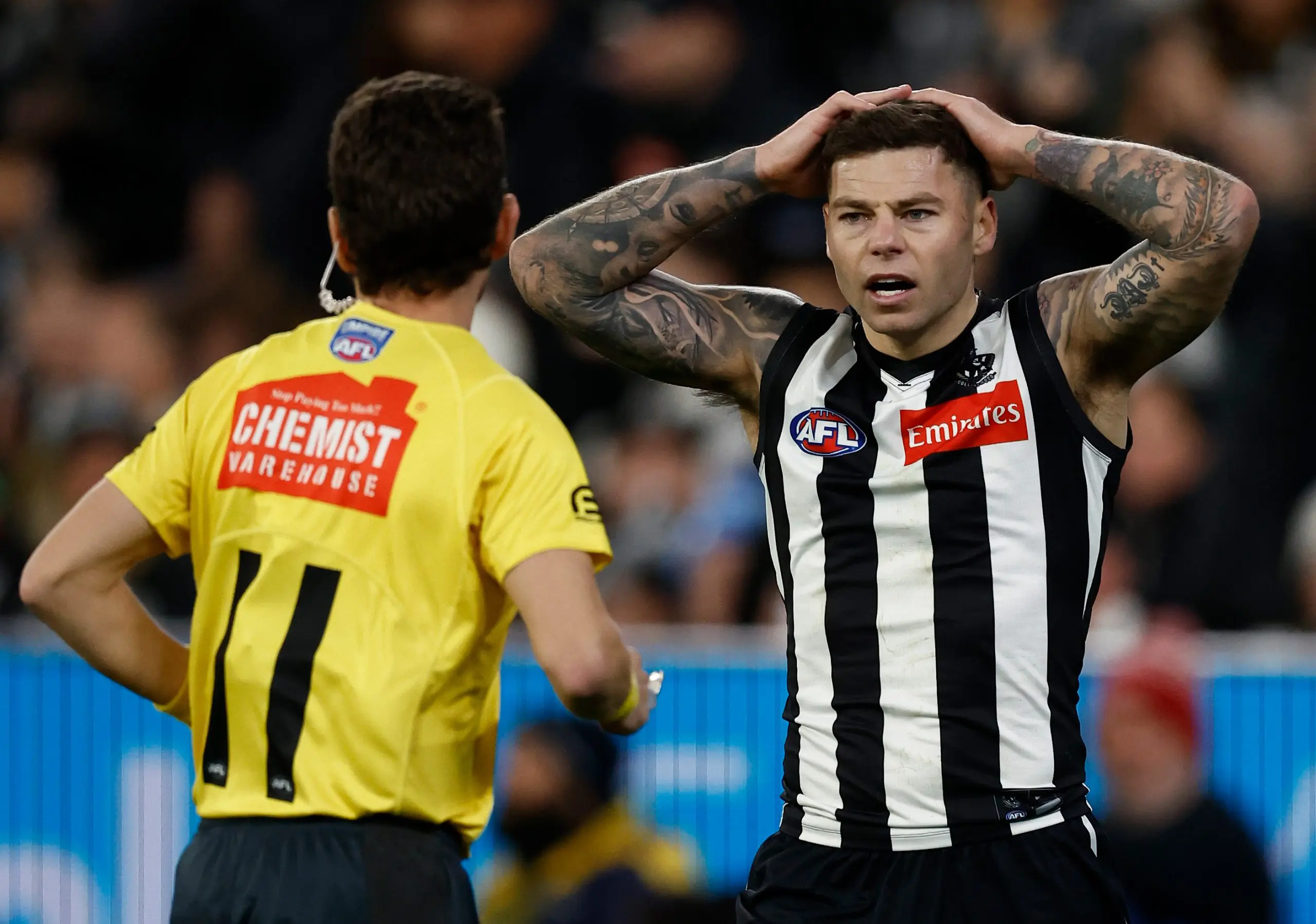 The Magpie faithful were up in arms that Elliott wasn't able to take a shot from directly in front, believing that the Lions defender made front-on contact that impeded the high-flying Collingwood forward's ability to mark the ball.