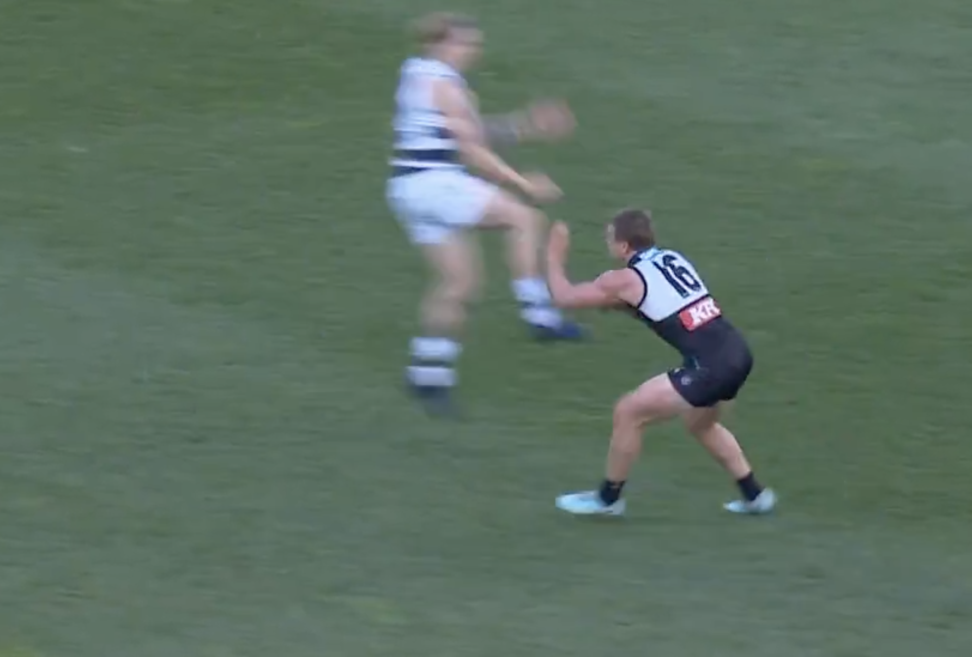 During Sunday's clash at GMHBA Stadium, Stewart can be seen leaving the ground to close the ball, but failed to make an impact. He then landed on Wines, hitting him high and causing the umpire to award a free kick to the Power.