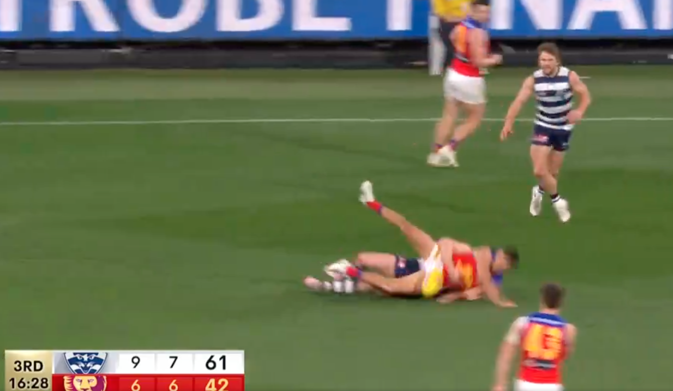 The Brownlow medallist can be seen dragging the young Lion, pinning one arm and subsequently penalised for the act.