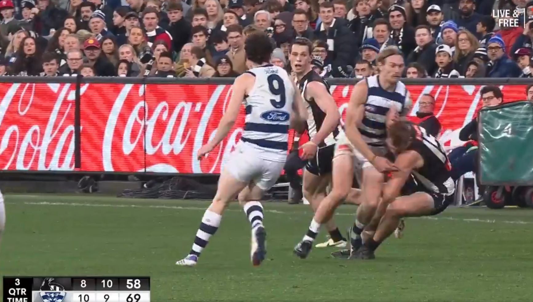 Geelong star Tom Stewart could face scrutiny from the Match Review Officer (MRO) for this knock on Collingwood's Nathan Kreuger during Friday's win at the MCG.