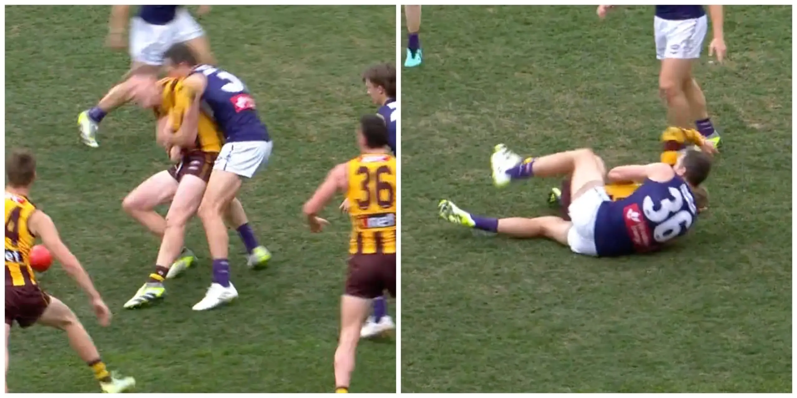Thomas' head managed to avoid hitting the surface, however the motion of the tackle prompted the umpire to pay a dangerous tackle free kick against Budarick.