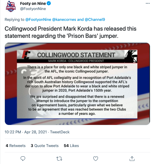 “In the spirit of AFL collegiality and in recognition of Port Adelaide’s rich South Australian history Collingwood supported the AFL’s decision to allow Port Adelaide to wear a black and white striped jumper in 2020, Port Adelaide 150th year.