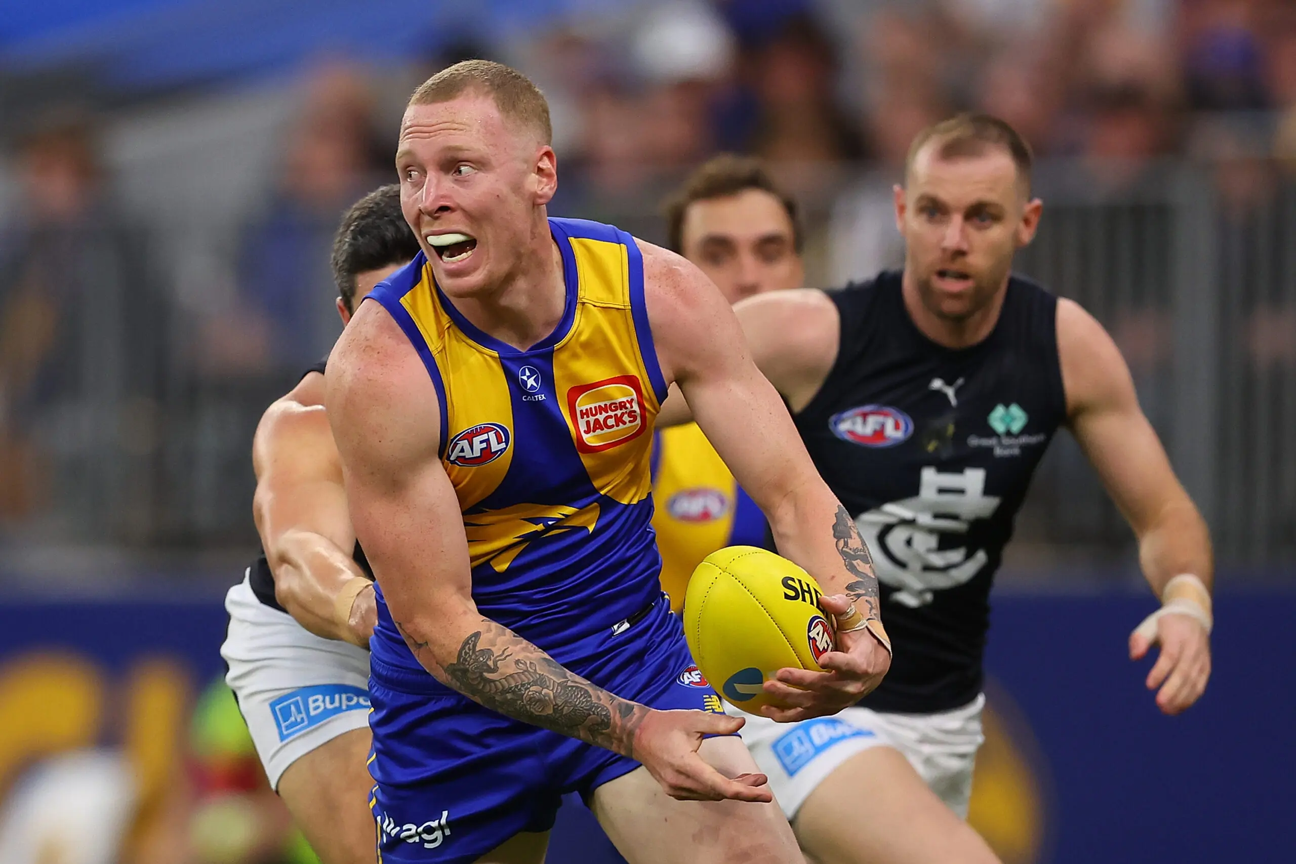 The following weeks would continue to be arduous for the West Coast ruckman, who managed no more than 20 hitouts in any of his next three matches against Giant Matt Flynn (20 hitouts), Fremantle star pairing Sean Darcy and Luke Jackson (14) and Demons recruit Brodie Grundy (19) - often requiring the assistance of forward Jake Waterman to pinch-hit.