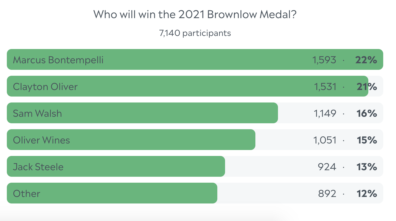 The top five favoured names in Oliver Wines, Marcus Bontempelli, Clayton Oliver, Sam Walsh and Jack Steele were listed as potential winners, with an 'others' option included for those tipping a dark horse.