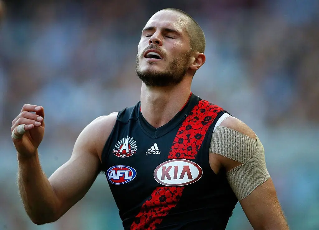 MELBOURNE, AUSTRALIA - APRIL 25: David Zaharakis of the Bombers looks dejected during the 2016 AFL Round 05 ANZAC Day match between the Collingwood Magpies and the Essendon Bombers at the Melbourne Cricket Ground, Melbourne on April 25, 2016. (Photo by Adam Trafford/AFL Media/Getty Images)