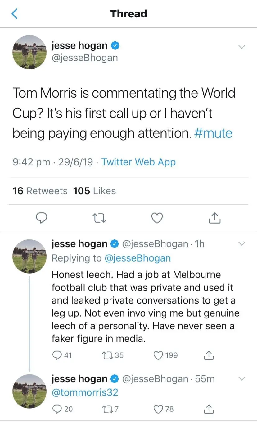 "Honest leech. Had a job at Melbourne football club that was private and used it and leaked private conversations to get a leg up," Hogan wrote.