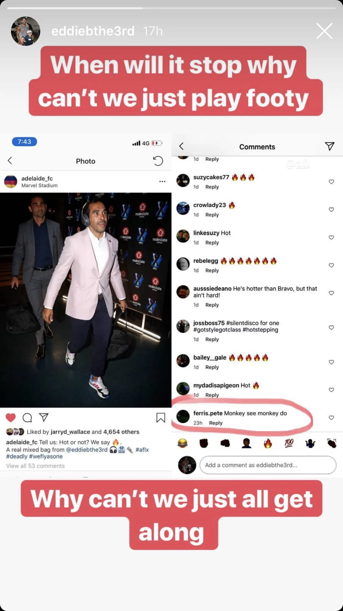 Betts circled a comment from user ferris.pete that read: "“monkey see monkey do”. He responded to the slur with: “When will it stop why can’t we just play footy. Why can’t we just all get along.”