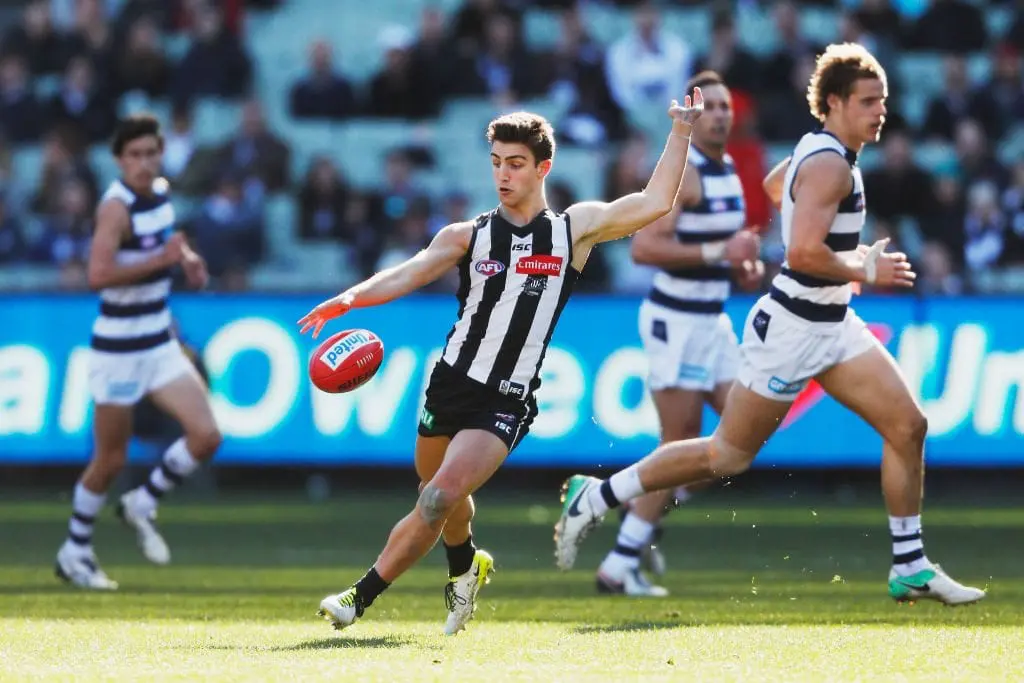MELBOURNE, AUSTRALIA - AUGUST 19: Josh Daicos kicks the ball during the round 22 AFL match between the Collingwood Magpies and the Geelong Cats at Melbourne Cricket Ground on August 19, 2017 in Melbourne, Australia. (Photo by Michael Dodge/Getty Images)