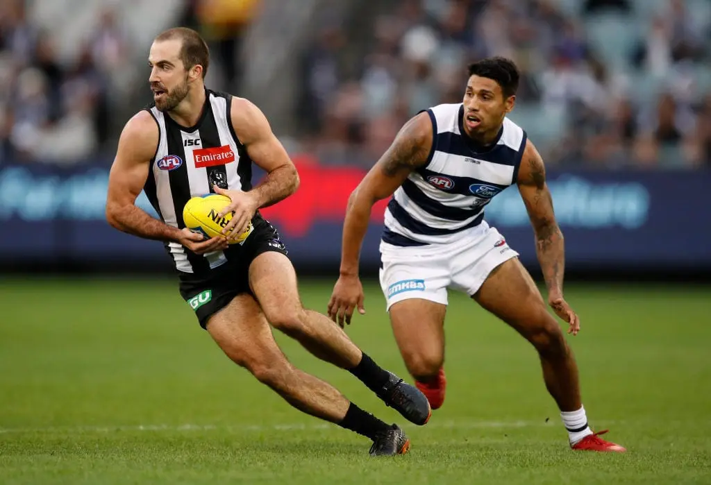 MELBOURNE, AUSTRALIA - MAY 13: Steele Sidebottom of the Magpies in action ahead of Tim Kelly of the Cats during the 2018 AFL round eight match between the Collingwood Magpies and the Geelong Cats at the Melbourne Cricket Ground on May 13, 2018 in Melbourne, Australia. (Photo by Adam Trafford/AFL Media/Getty Images)