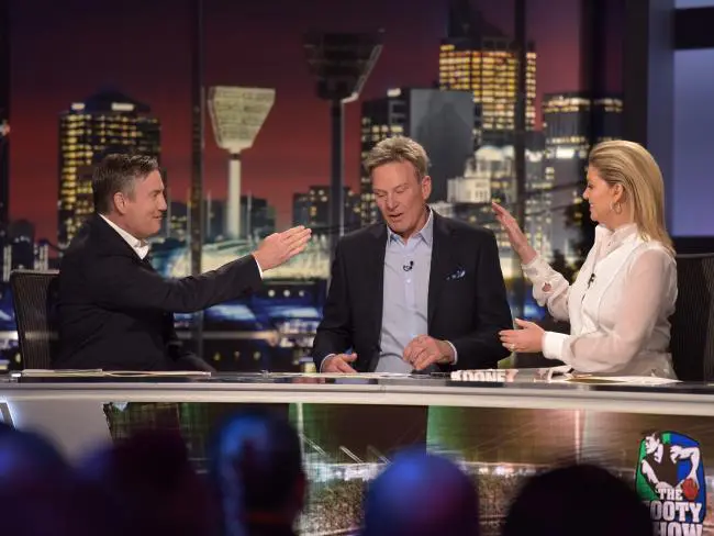 The Collingwood president and Rebecca Maddern shared the hosting roles on the left of the desk with Sam Newman in the middle of the pair.