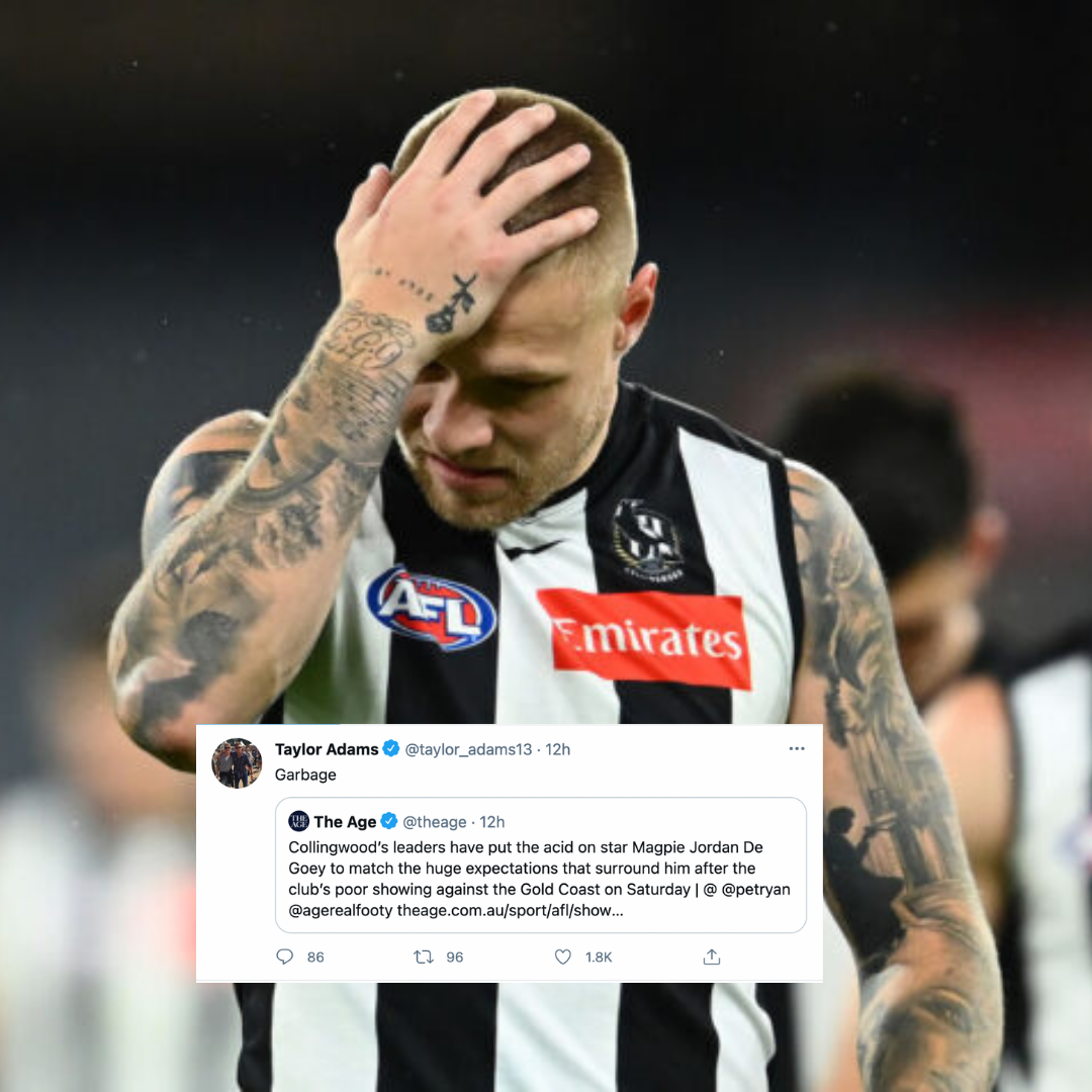 Injured Magpies vice-captain Taylor Adams earlier this week shot down a report by The Age's Peter Ryan that senior leaders at the club put heat on Jordan De Goey after a disappointing effort against the Gold Coast on Saturday.