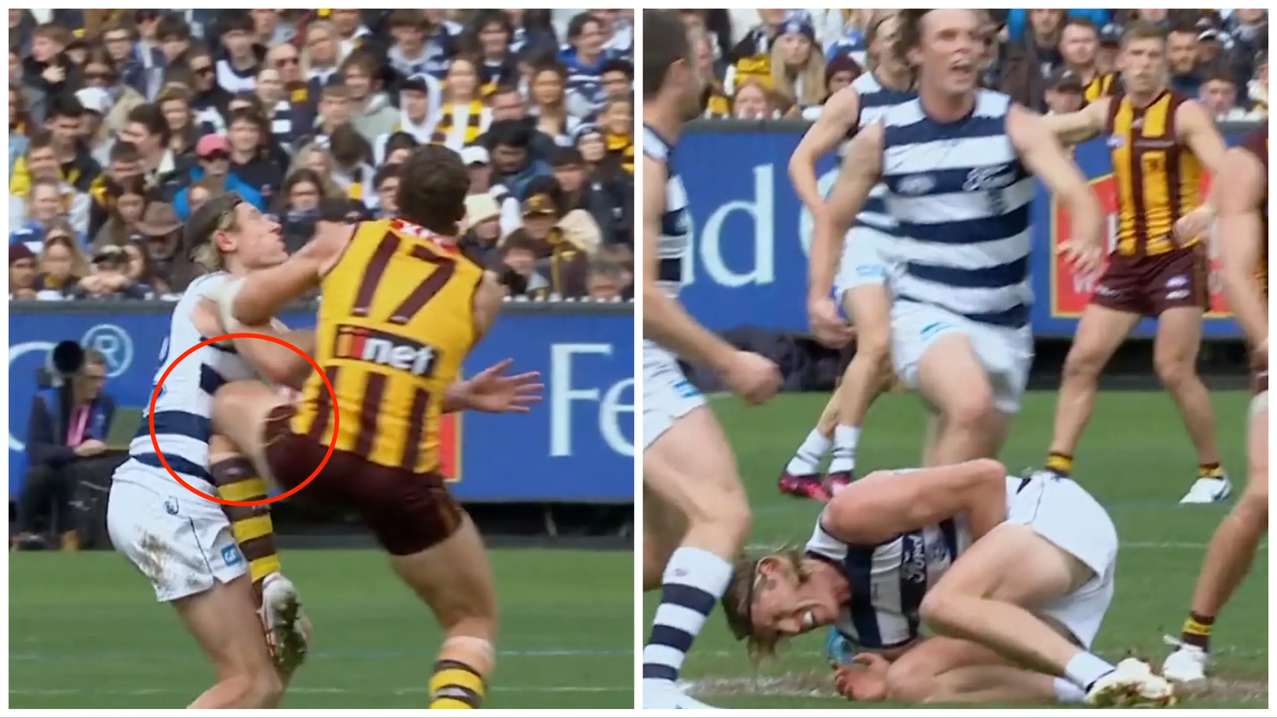 All-Australian Mark Blicavs was left in pain in the centre of the MCG on Monday after a raised knee from Hawthorn ruckman Lloyd Meek struck Blicavs' torso, with the Cats tall assisted off the field and in the hands of club medical staff in the opening term of Geelong's win.