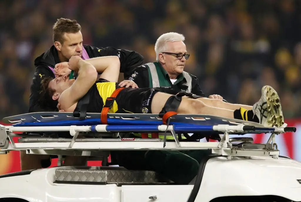 The former pick six, who was playing in his 100th game, twisted his ankle in a tackle by Lance Franklin and Tom McCartin at Etihad Stadium during the first quarter.