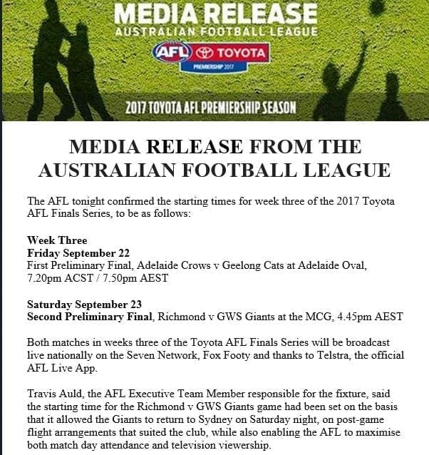 The AFL have confirmed the start time for next Saturday afternoon's second preliminary final between Richmond and GWS at the MCG.