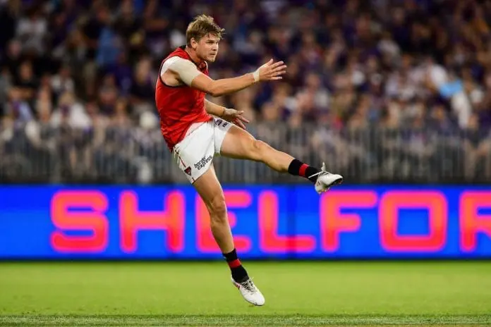 PERTH, AUSTRALIA - MARCH 31: Michael Hurley of the Bombers kicks the ball during the 2018 AFL round 02 match between the Fremantle Dockers and the Essendon Bombers at Optus Stadium on March 31, 2018 in Perth, Australia. (Photo by Daniel Carson/AFL Media/Getty Images)