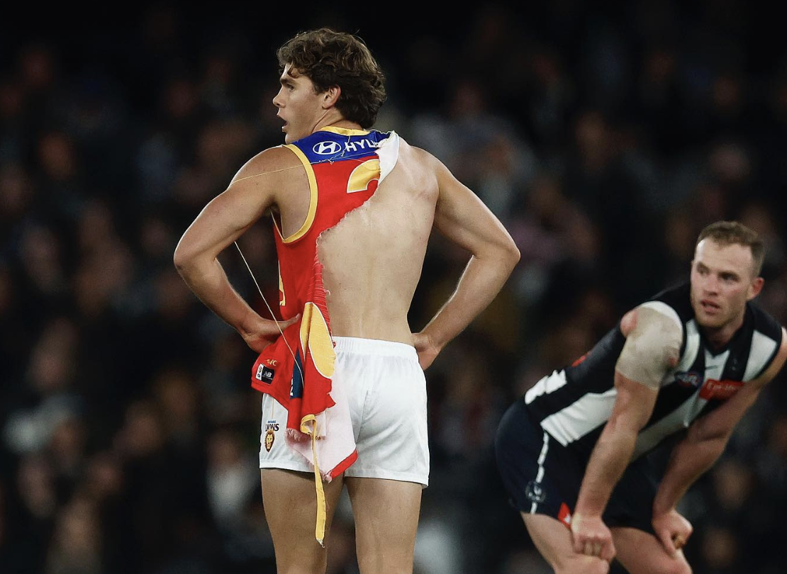 Robertson has become a pin-up boy at Brisbane after his jumper was ripped from his body amid a fiery contest with the Magpies, with the 22-year-old deciding to continue in the match topless for some time before being handed a new jumper.