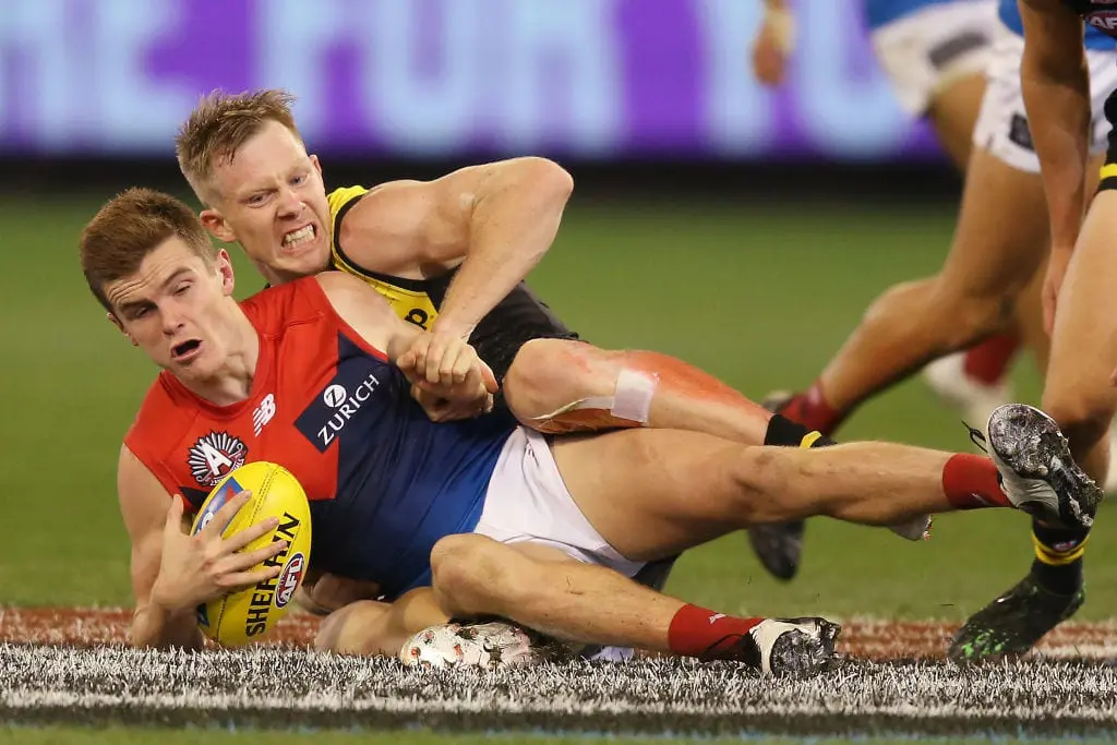 Three players from Wednesday night's clash between Richmond and Melbourne have been handed fines by Match Review Officer Michael Christian, including Tigers forward Jack Riewoldt for his 'chicken wing' tackle on Bailey Fritsch.