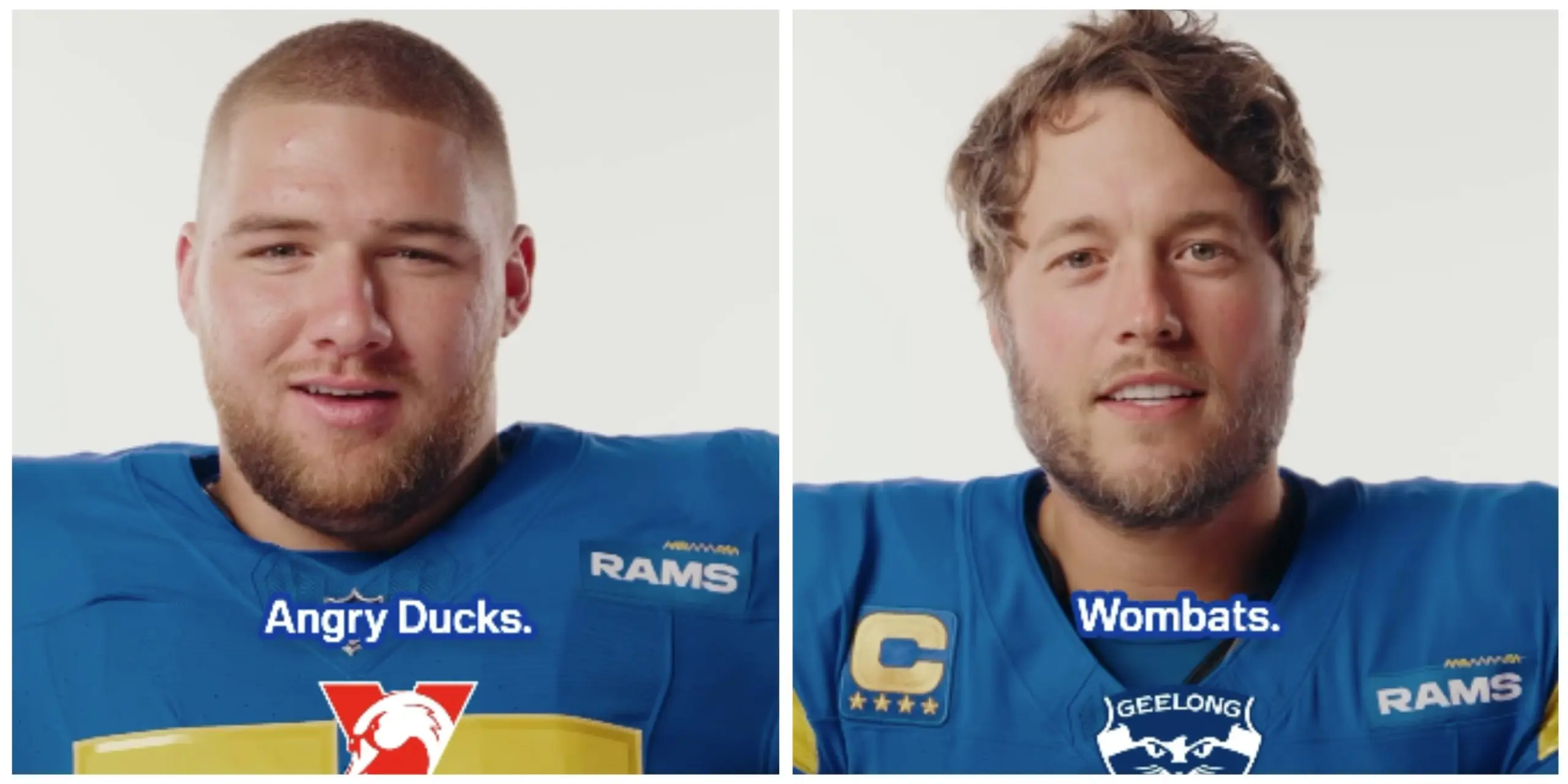 Rams quarterback Matthew Stafford was joined by teammates Braden Fiske, Demarcus Robinson and Tutu Atwell in guessing a handful of AFL club nicknames in the wake of the team's confirmed venture to the MCG next year for a regular season game.