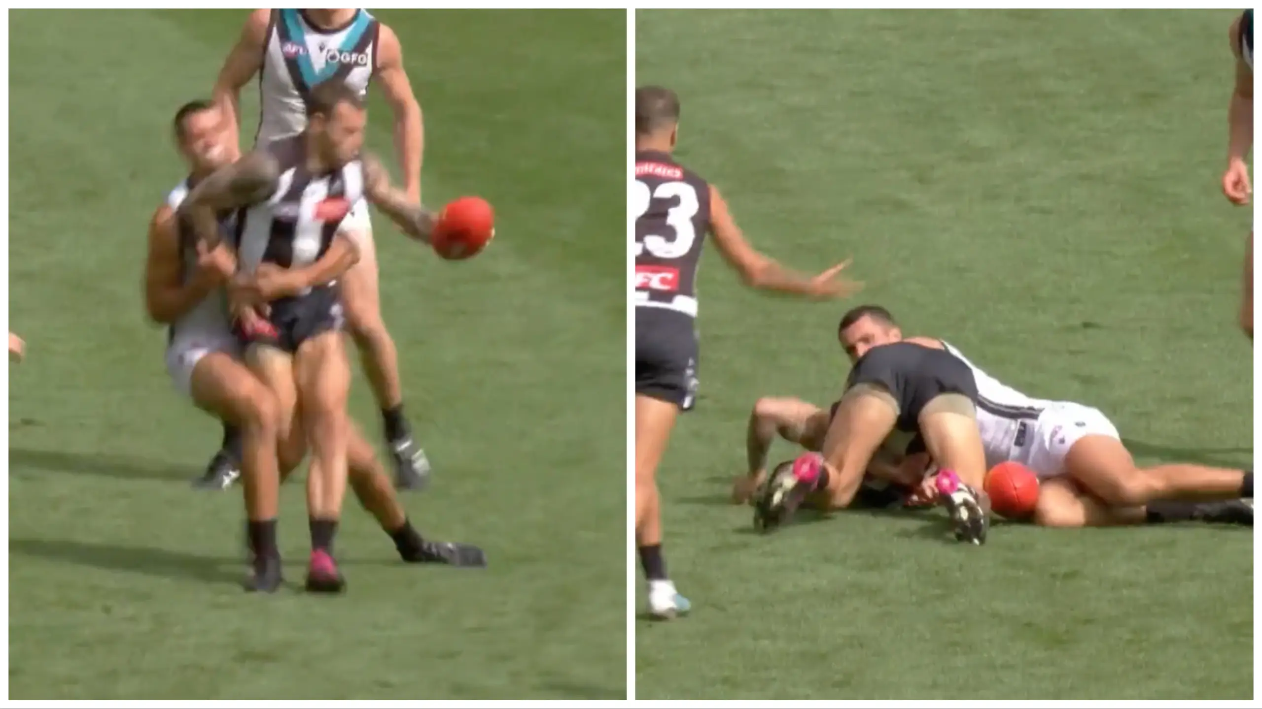 In the early stages of the second half, Burton, having pinned Elliott's right arm in a tackle, dumped the Pies forward, resulting in a free kick and set shot at goal for Collingwood.