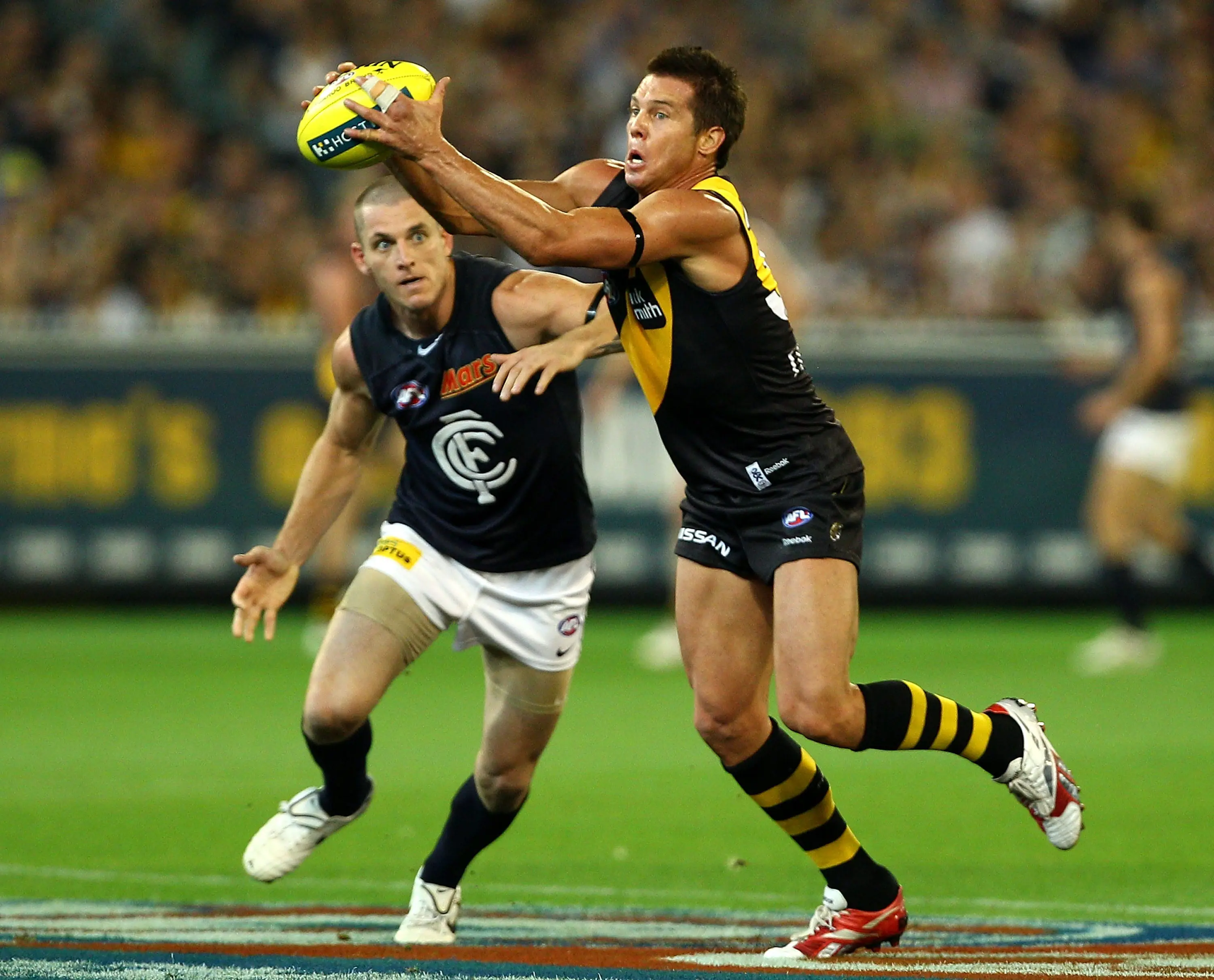 Which two players bagged an equal game-high five goals in the 2018 clash between Richmond and Carlton?