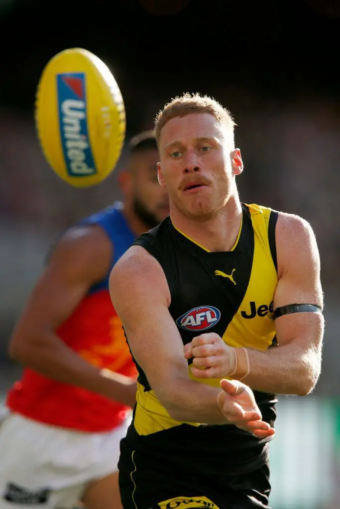 MELBOURNE, AUSTRALIA - AUGUST 25: Nick Vlastuin of the Tigers handballs during the round 23 AFL match between the Richmond Tigers and the Brisbane Lions at Melbourne Cricket Ground on August 25, 2019 in Melbourne, Australia. (Photo by Darrian Traynor/Getty Images)