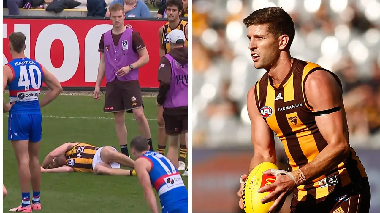 Retiring Hawthorn legend and three-time premiership hero Luke Breust has sustained a devastating knee injury during the VFL preliminary final between the Box Hill Hawks and Footscray Bulldogs.