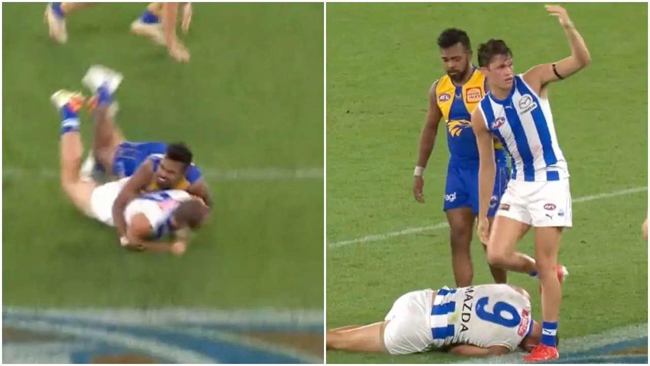 Initial fears suspected Davies-Uniacke sustained a shoulder injury after being tackled by Eagles forward Willie Rioli in the second quarter of the match, however the Roos midfielder also appeared groggy as he was assisted off the field.