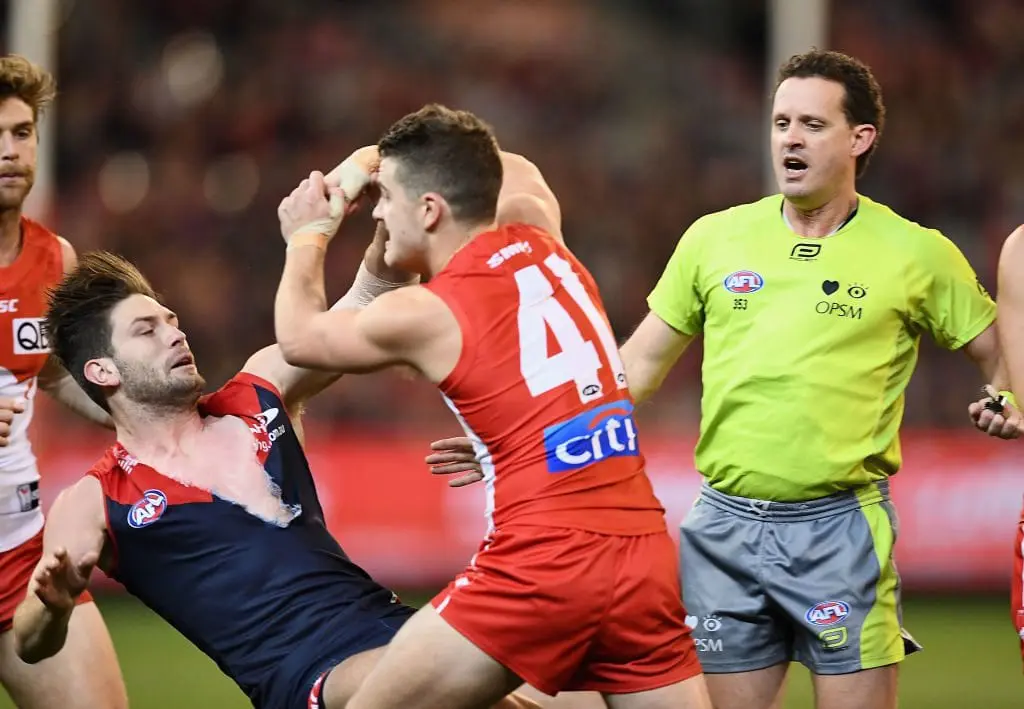 Tomas Bugg has been reported for this strike on Callum Mills. #AFLDeesSwans pic.twitter.com/ADWjAjpC5e