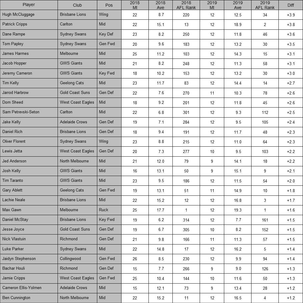 The third most improved player is Sydney's Dane Rampe at +3.6. While the All-Australian defender has made some late-game blunders against Essendon and Collingwood, he is averaging a career-high in disposals (19.7), tackles (3.1).