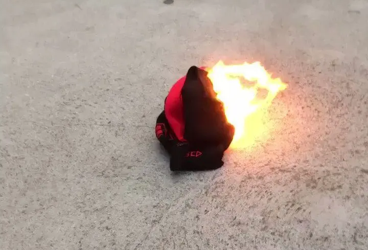 A tweet from Carlton fan Adrian (@ajs071) captures a piece on merchandise on fire at the MCG, moments after the Bombers fell to Carlton by 13 points.