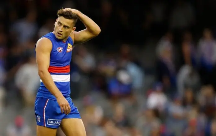 MELBOURNE, AUSTRALIA - APRIL 1: Luke Dahlhaus of the Bulldogs looks dejected after a loss during the 2018 AFL round 02 match between the Western Bulldogs and the West Coast Eagles at Etihad Stadium on April 1, 2018 in Melbourne, Australia. (Photo by Adam Trafford/AFL Media/Getty Images)