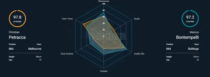 The All-Australian duo impact the scoreboard and can win the ball on the inside and outside. The duo who are heavily in Brownlow contention and are averaging 1.3 goals a game and while Petracca has got more of the footy so far 'The Bont' is ahead in goal assists with 1.2 a game.