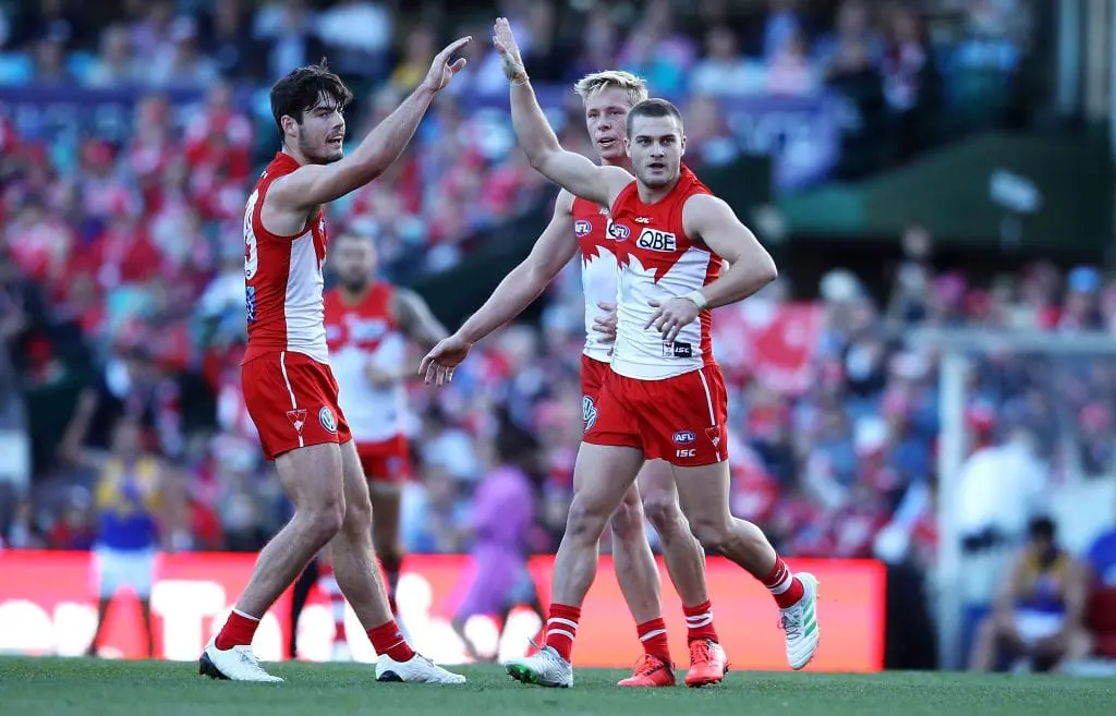 SYDNEY , AUSTRALIA - JUNE 09: George Hewett , Isaac Heeney and Tom Papley of the Swans celebrate Tom Papley kicking a goal during the round 12 AFL match between the Sydney Swans and the West Coast Eagles at Sydney Cricket Ground on June 09, 2019 in Sydney , Australia. (Photo by Mark Kolbe/Getty Images)Back 1 - Adelaide 2 - Brisbane 3 - Carlton 4 - Collingwood 5 - Essendon 6 - Fremantle 7 - Geelong 8 - Greater Western Sydney 9 - Gold Coast 10 - Hawthorn 11 - Melbourne 12 - North Melbourne 13 - Port Adelaide 14 - Richmond 15 - St Kilda 16 - Sydney 17 - West Coast 18 - Western Bulldogs